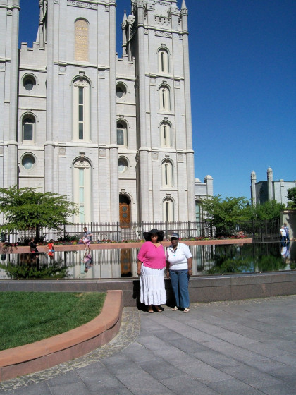 We got off to an early start in the hope of seeing some Utah before leaving the state. Since we were already so close to the Great Salt Lake, we decided to pay it a visit. The gift shop was just opening when we arrived, and the lake area was pretty much occupied only by flying insects–lots of flying insects that made us decide not to get out and explore. It was impossible to tell whether the intense aroma was coming from the water or from nearby industry. The salesperson in the gift shop (the building with the golden domes on top) had time to give us lots of information about the lake since we were her first customers for the day. Time was short since we wanted to be in Las Vegas before very late due a very early start on Wednesday. So, we drove into Salt Lake…