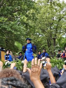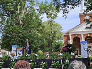 I spent a quiet Friday evening driving around town–glad to see that Moore Music, the store where I had spent many hours over the years purchasing flute and vocal music was still there when so many other brick-and-mortar stores have closed, got dinner and made another doughnut run. The next morning, I attended the Commencement exercises held in front of Bennett’s Chapel. The speaker was Tammi Mac ’94, acclaimed broadcaster, actress, and playwright.