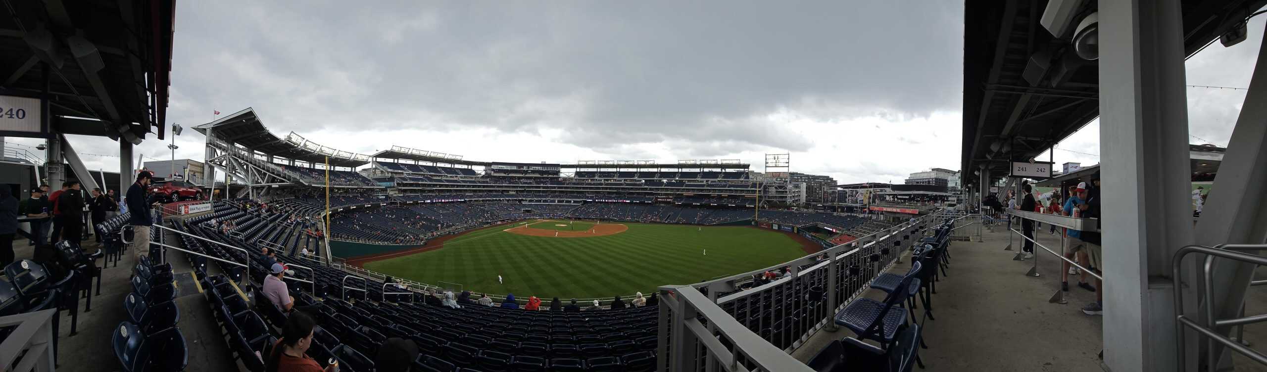 I do like to take pictures of large venues using panoramic view, so here’s one of the Nationals’ ballpark (and the clouds bearing down upon it):