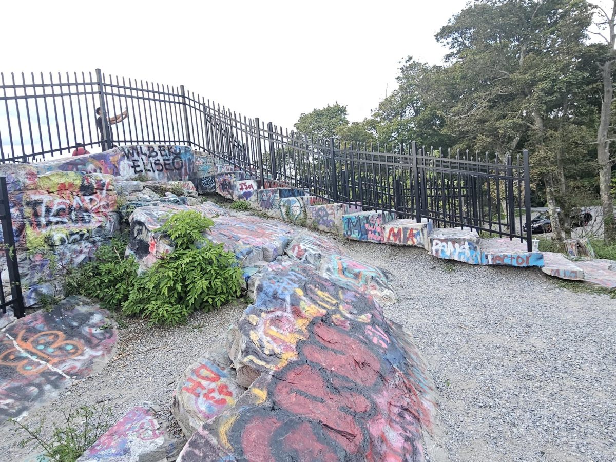 Throughout the day, I kept looking at the sky, first to find a large enough view for sky watching, then more worriedly at the heavy cloud cover that portended the probability of an obstructed view. After a long, mountainous ride, I reached the spot where, although I saw no signage, the heavy presence of drawings–every rock had some image or words painted on them–I concluded that this was the location the ranger suggested.