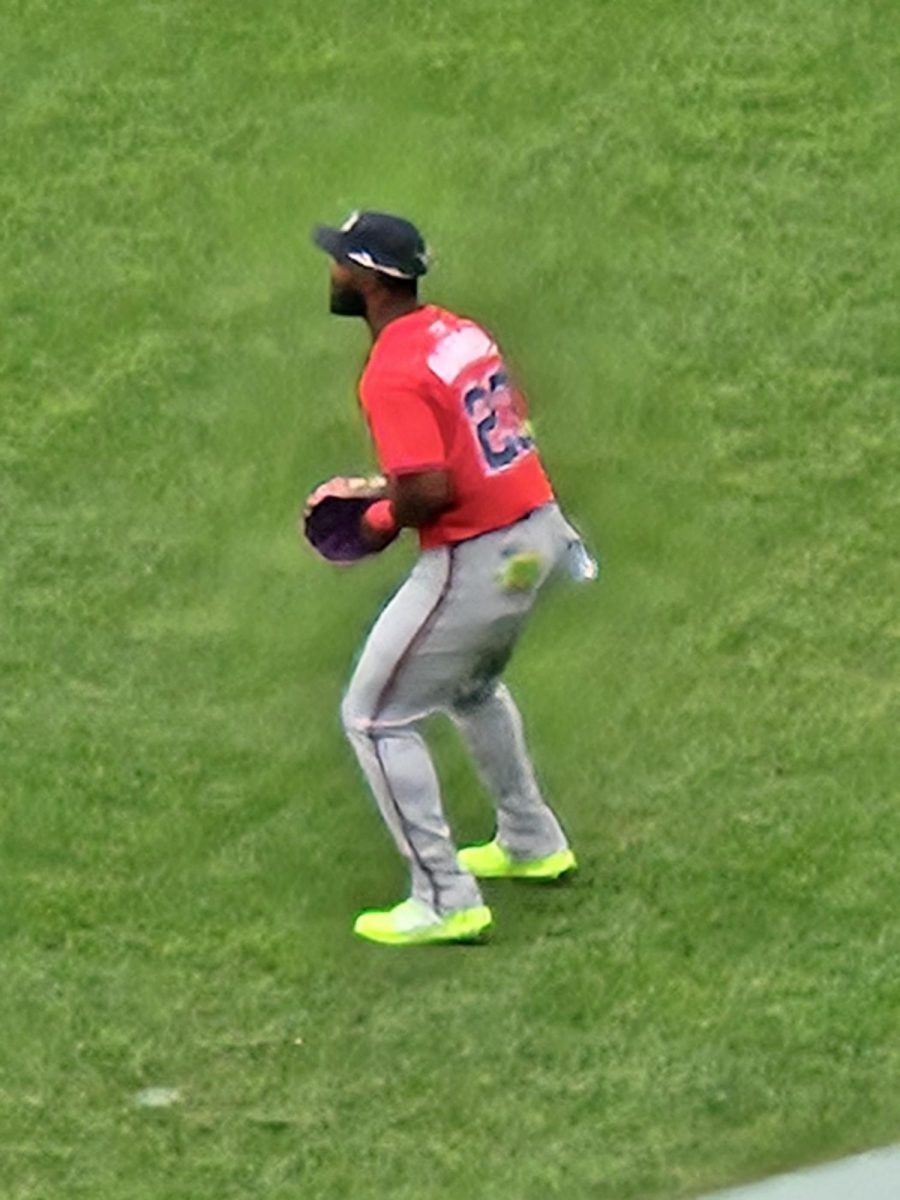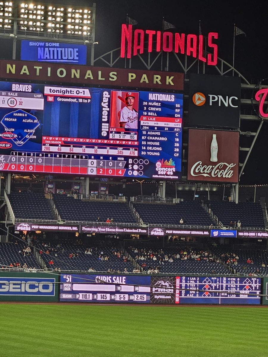 Unfortunately, the clouds that had been threatening yielded rain heavy enough that they barely completed the afternoon game, and then they had to add a two-hour delay to the start of the evening game. Also, based on the jerseys and t-shirts worn by the rather small crowd–I had on a new jersey with Henry Aaron’s number 44 on it–and it was a great coincidence that the colors matched the uniforms the team wore that day, there were as many Braves fans present as were Nationals fans. It was also pretty chilly to me as the evening waned and spotty rain continued. Thank goodness I brought my jean jacket and a hat, plus my seats were both under sheltered areas.