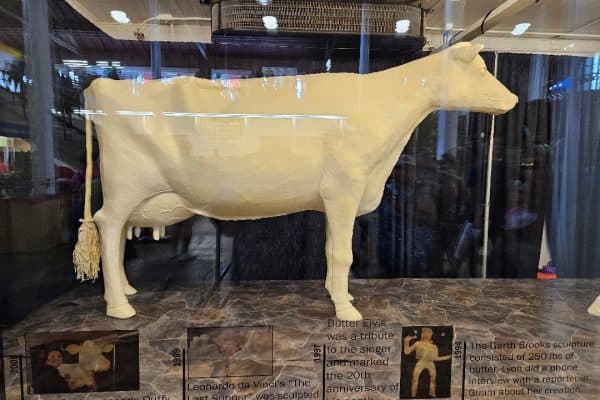 I had agreed to volunteer a couple of hours at the state Democratic Party booth at the Iowa State Fair. I hadn’t attended the fair since my first visit with my host daughter in 2009, so this seemed a great excuse to make a final trip before I head back East. Considering that I was Des Moines on Sunday, August 13, at a site that has drawn more than one million visitors during the 11-day annual event, I was lucky my handicap decal got me so close to one of the gates. Still, it’s a big site with lots of walking, and I decided not to spend the $70 to rent a motorized scooter for the day so my progress was slow. Coincidentally, I was close to the building where the famous butter cow was on display with Iowa sports figures Jack Trice, Kurt Warner and Caitlin Clark. I walked…