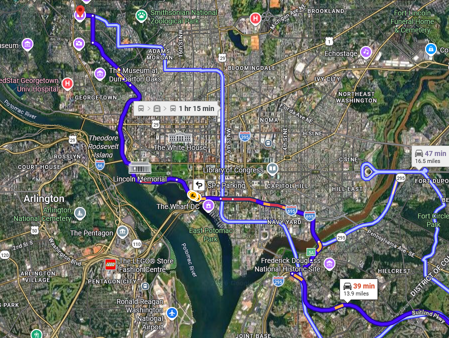 What was even better was that the route Google Maps gave me to drive to the National Cathedral (see the dark blue route indicated on the map above) took me through the heart of the florid display, from the Washington Monument to the northern edge of the Tidal Basin.