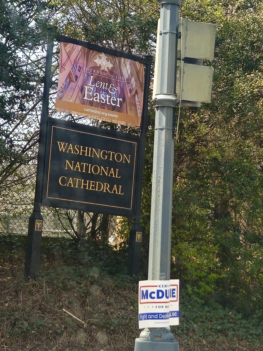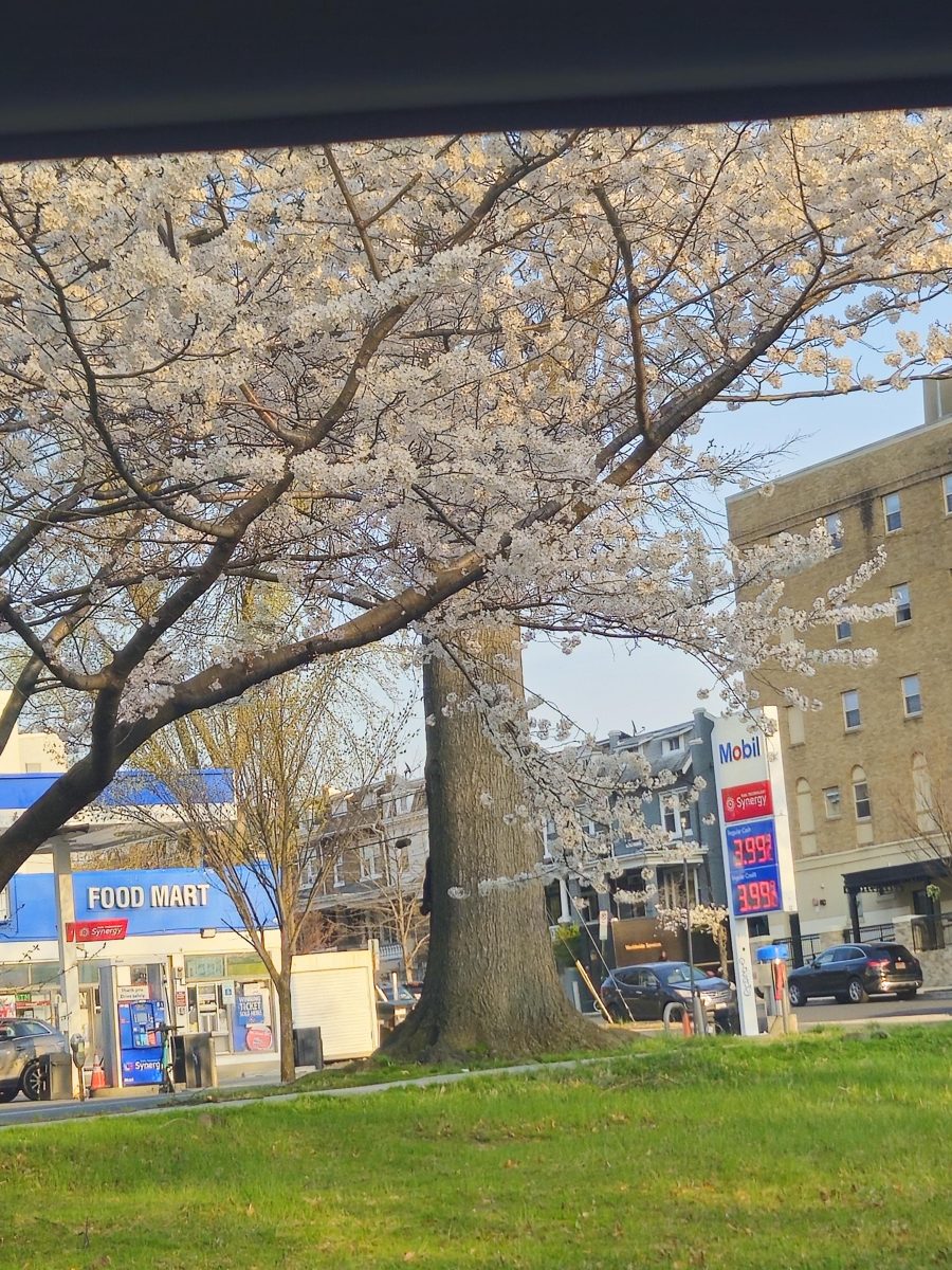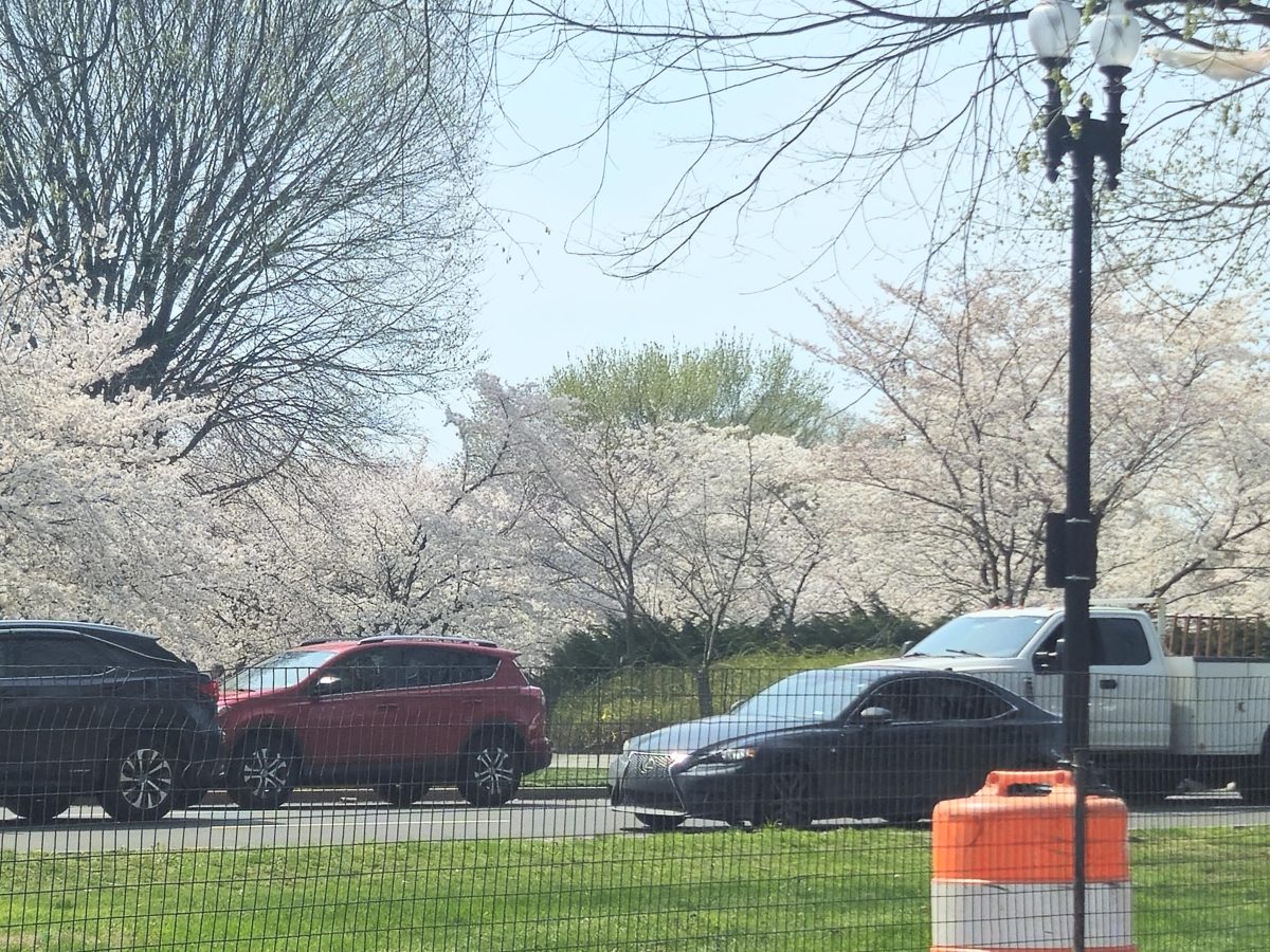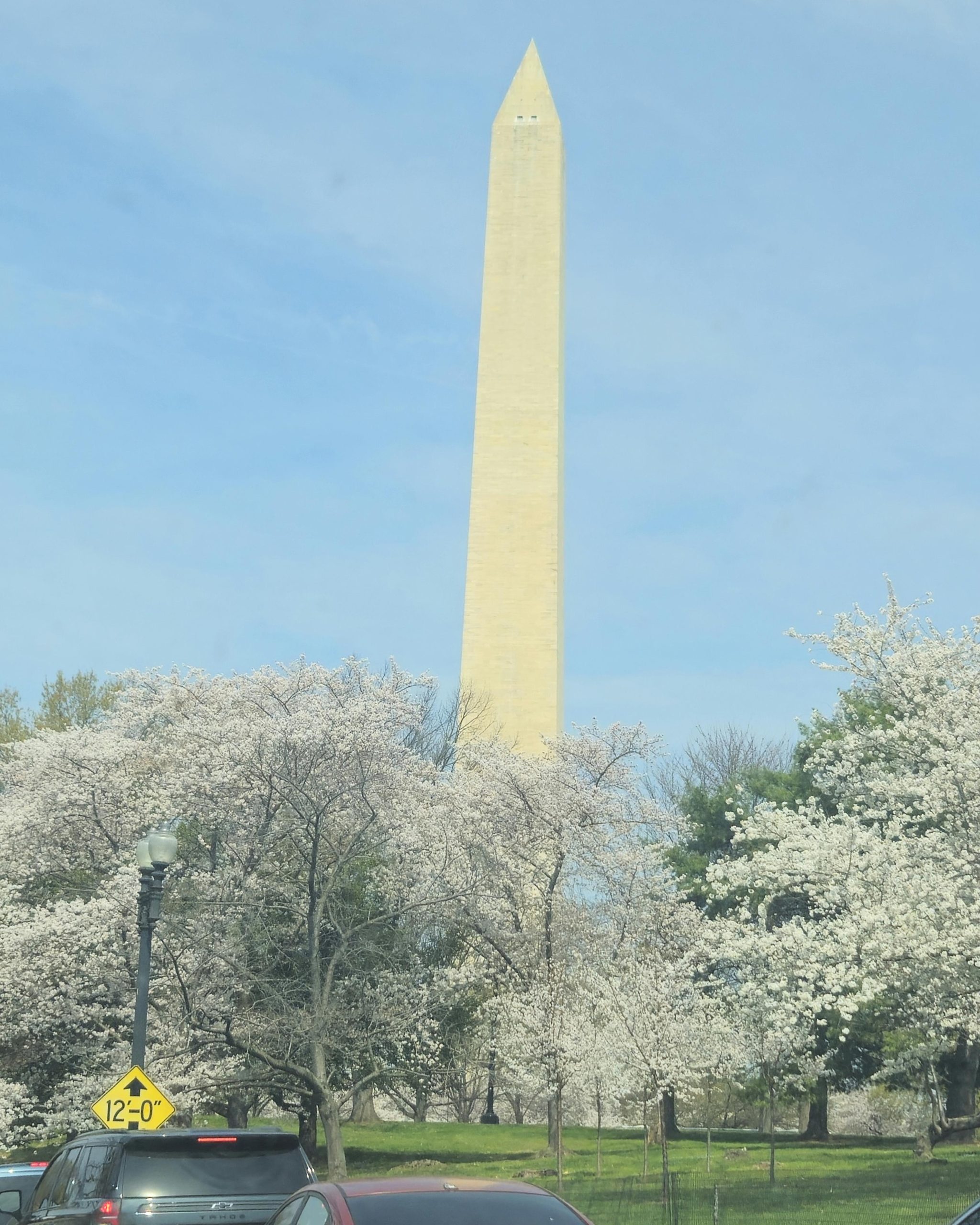 I took advantage of every stoplight and the light traffic–the announcement had only been out a brief time, so folk hadn’t flooded into the area yet–to take as many pictures as I could. One of my favorites is this one of the monument with its base completely hidden by blossoms. A few of the rest will be included at the end of this post, and the remainder are at https://singin1.click/piwigo/index.php?/category/Seein-the-DMV-Cherry-Blossoms-National-Cathedral-032626 along the usual map detail where each picture was taken.