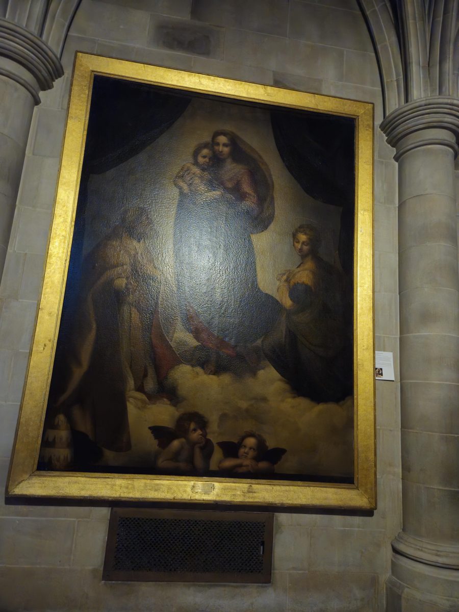 Following the earlier suggestions, I next went downstairs to the Crypt, where there were smaller chapels that had served as worship spaces while the cathedral was originally under construction. I was particularly interested in the colorful panels, organs, and beautiful edifices. Among the paintings in the lower level was a copy of Raphael’s Madonna di San Sisto.
